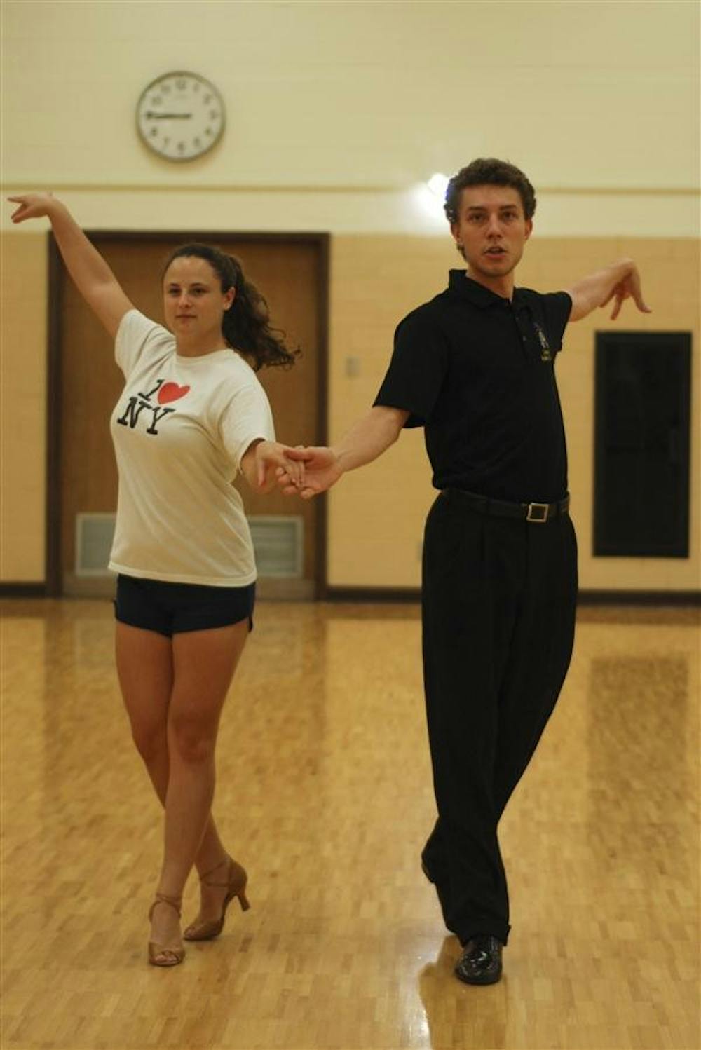 Junior Carl Kensicki and sophomore Rebecca Mandell of the IU Dancesport Team teach students a Cha Cha routine during free classes Monday at the School of Health, Physical Education and Recreation. The class later moved onto Tango for more experienced dancers. The Dancesport Team is offering one more free class like this one Wednesday at 8:30 pm in HPER 171.