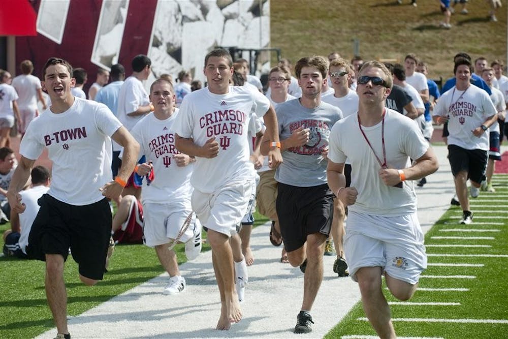 Members of the white team warm up before IU's attempt at breaking the record for the world's largest game of dodgeball Sunday at Memorial Stadium. Peter Stevenson