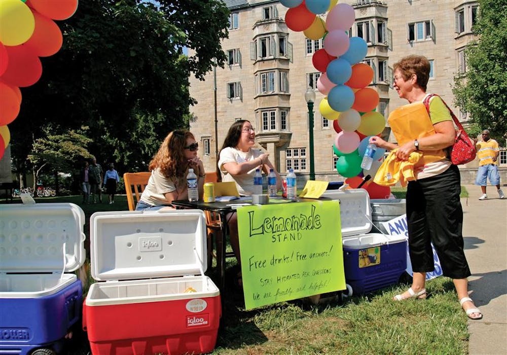 Students and family members enjoy free refreshments and information provided by Collins Living-Learning Center during move-in.