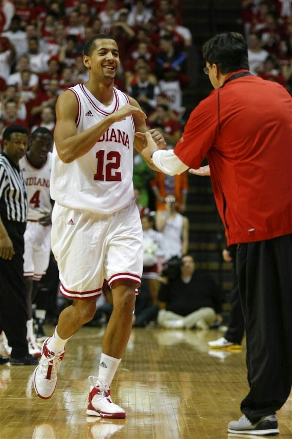 Senior guard Verdell Jones III is greeted by Tom Crean at the end IU's 103-89 win against Iowa on Sunday at Assembly Hall. Mark Felix
