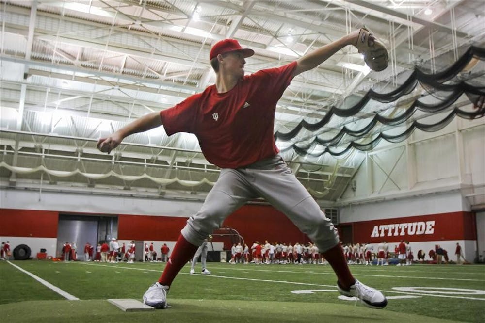 Sophomore pitcher Aaron Slegers works on different pitches Tuesday at John Mellencamp Pavilion. Mark Felix