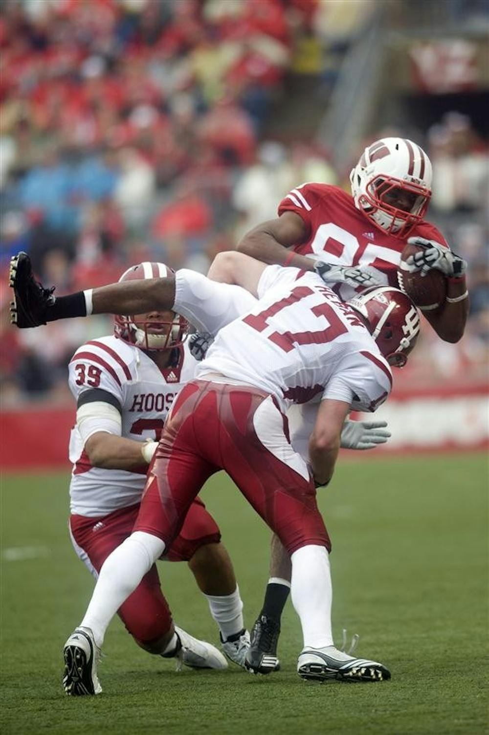Freshman cornerback Greg Heban and junior linebacker Brandon McGhee tackle Wisconsin's David Gilreath during IU's 83-20 loss to the Badgers on Saturday in Madison, Wis. Peter Stevenson