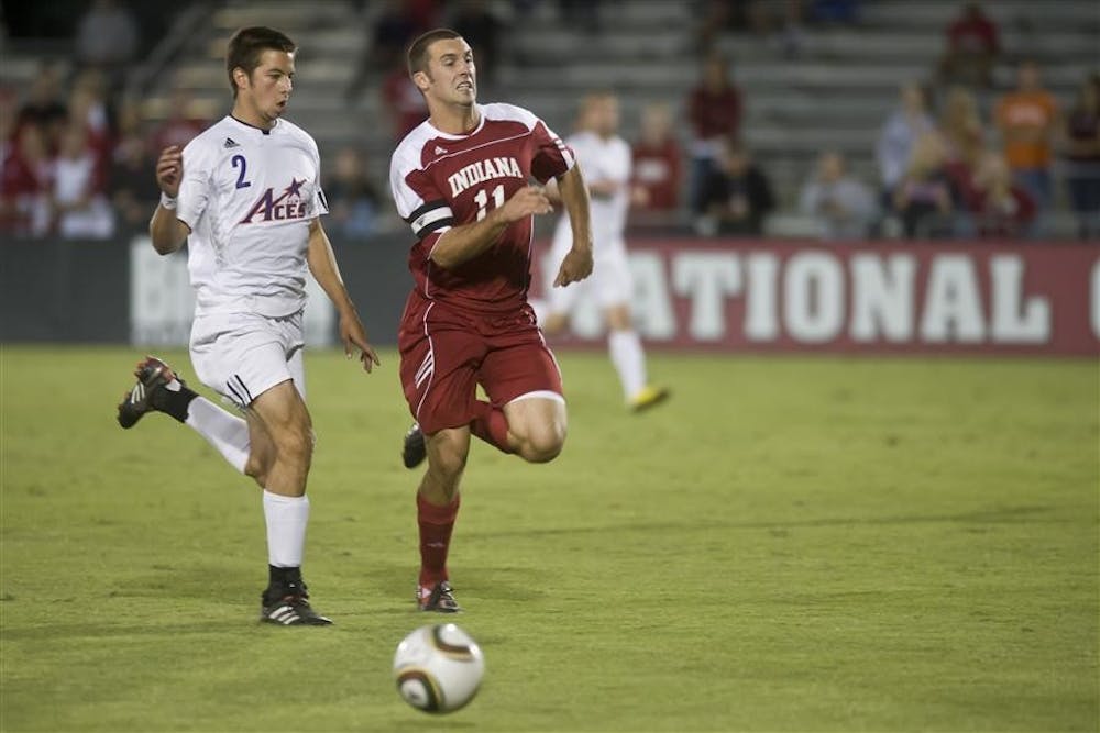 Junior forward Will Bruin races Evansville's Brandon Causey to the ball during IU's 1-0 win against Evansville Wednesday at Bill Armstrong Stadium. Peter Stevenson