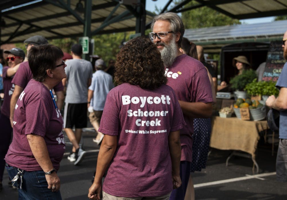 A group of protesters in the Purple Shirt Brigade stand in front of Schooner Creek Farm’s booth Sept. 28 at the Bloomington Community Farmers’ Market. The people gathered to protest the owner, Sarah Dye, who is a member of American Identity Movement, formerly known as Identity Evropa.