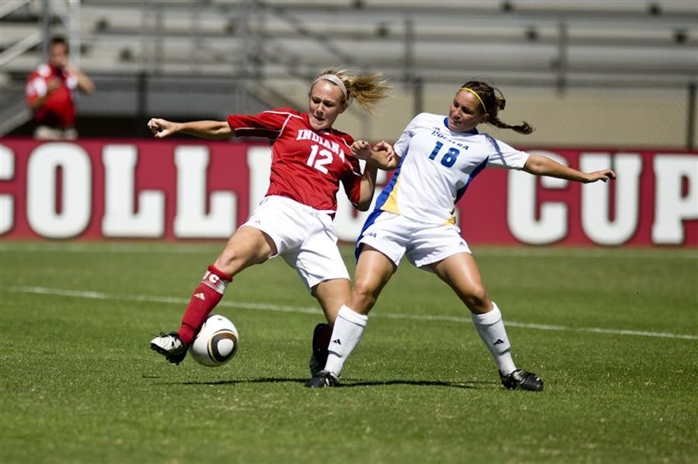 Senior forward Leigh Ann Cummings dribbles past Hofstra's Tiffany Yovino during IU's 3-1 loss to the Pride on Sunday at Bill Armstrong Stadium. Peter Stevenson
