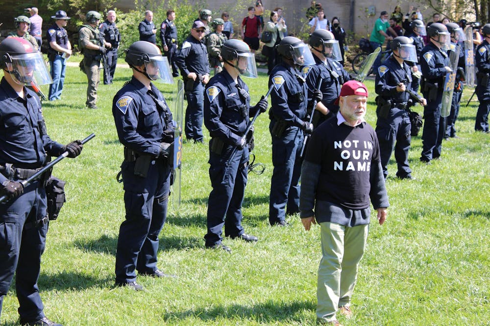 IU professor Benjamin Robinson stands between protesters and a line of police officers armed with riot gear April 25, 2024, in Dunn Meadow in Bloomington. Robinson was investigated for violating intellectual diversity this year.