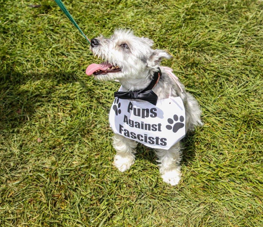 Yue, a dog, wears a bib reading "Pups against fascists." Many protesters brought their pets along Saturday. Maxine Cain