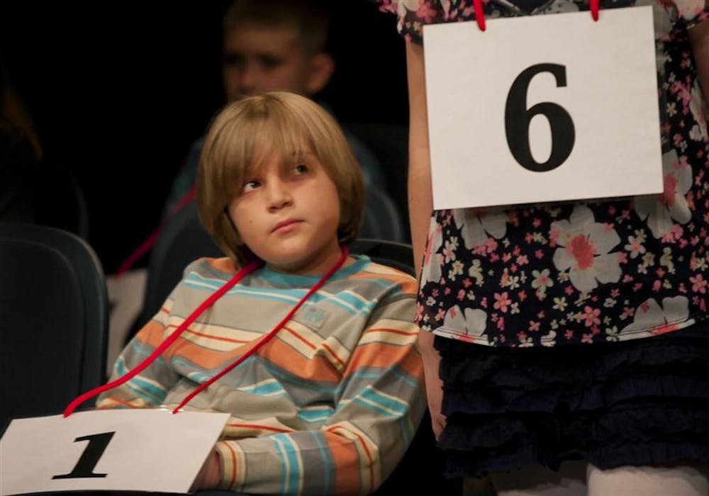 Binford Elementary School 5th grader Oscar Triggs watches as another participant of the IU Bee 2012 walks up to the microphone Saturday at the Monroe County Public Library.