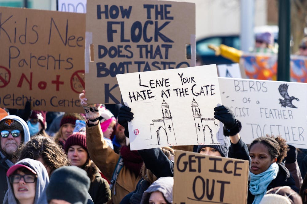 Signs are held at an anti-ICE protest Jan. 30, 2026, at City Hall in Bloomington. About 400 demonstrators crowded around City Hall in sub-freezing temperatures for an event organized by the Bloomington branch of the Democratic Socialists of America.