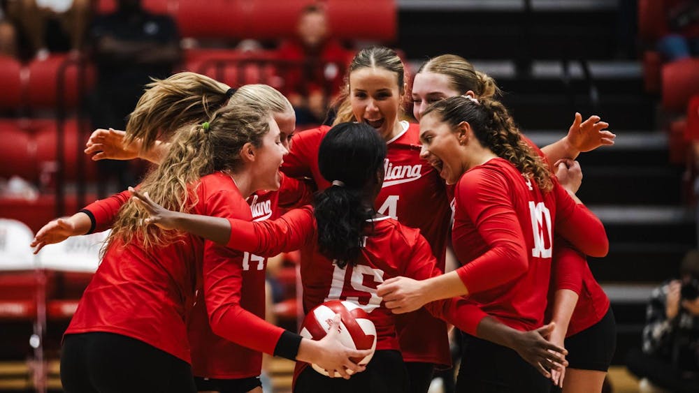 The Indiana volleyball team celebrates Sept. 13, 2024, during a match against Chicago State University at Wilkinson Hall in Bloomington. The Hoosiers finished the 2024 season with an overall record of 15-15. Giselle Marsteller