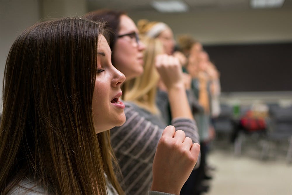 Abigail Pendland, along with IU's all-female a cappella group Ladies First, rehearses Wednesday at the Simon Music Center . They prepare for the ICCA Midwest Quarterfinal this Saturday, Jan. 30 at the IU Auditorium.