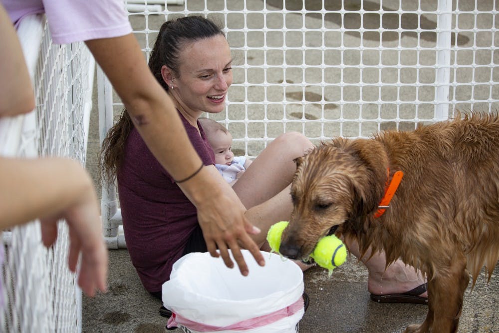 Rikki, a 3-year-old Golden Retriever, holds a toy in his mouth Aug. 8 during the Drool in the Pool event at Mills Swimming Pool. Bloomington dog owners were able to bring their pets to the pool where they could swim, relax on the patio and participate in a long-jumping competition.