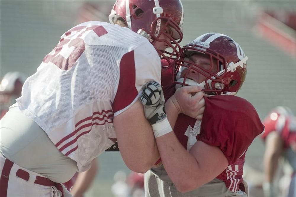 Offensive lineman Marc Damisch (left) blocks a pass rusher during spring practice drills Thursday at Memorial Stadium. Peter Stevenson