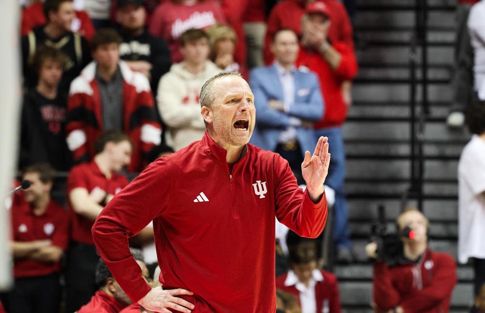 Head coach Darian DeVries calls out to his players during the game against Purdue on Jan. 27, 2026, at Simon Skjodt Assembly Hall in Bloomington. Indiana outscored Purdue 40-29 in the first half. Sophia Kaplan