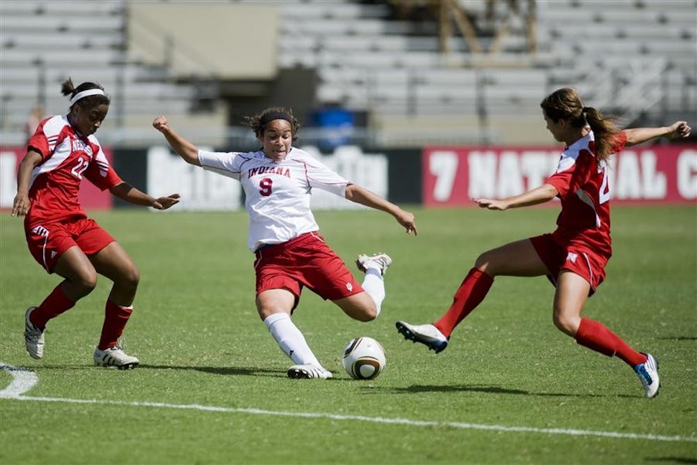 Sophomore forward Orianica Velasquez takes a shot during IU's 3-1 loss to Nebraska on Saturday at Bill Armstrong Stadium.