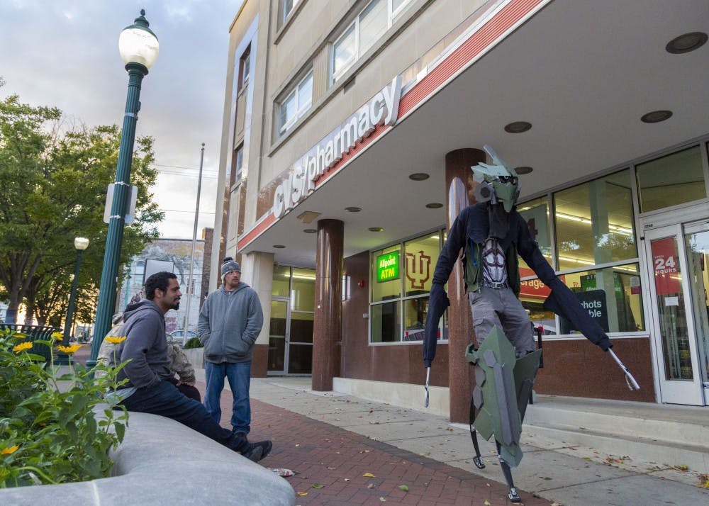People watch as Reilly Donaldson walks down the sidewalk in his "Skeleton Harvester" costume Oct. 20 on Kirkwood Avenue. Throughout his walks, people often stop him to take selfies with him in his costume. Matt Begala