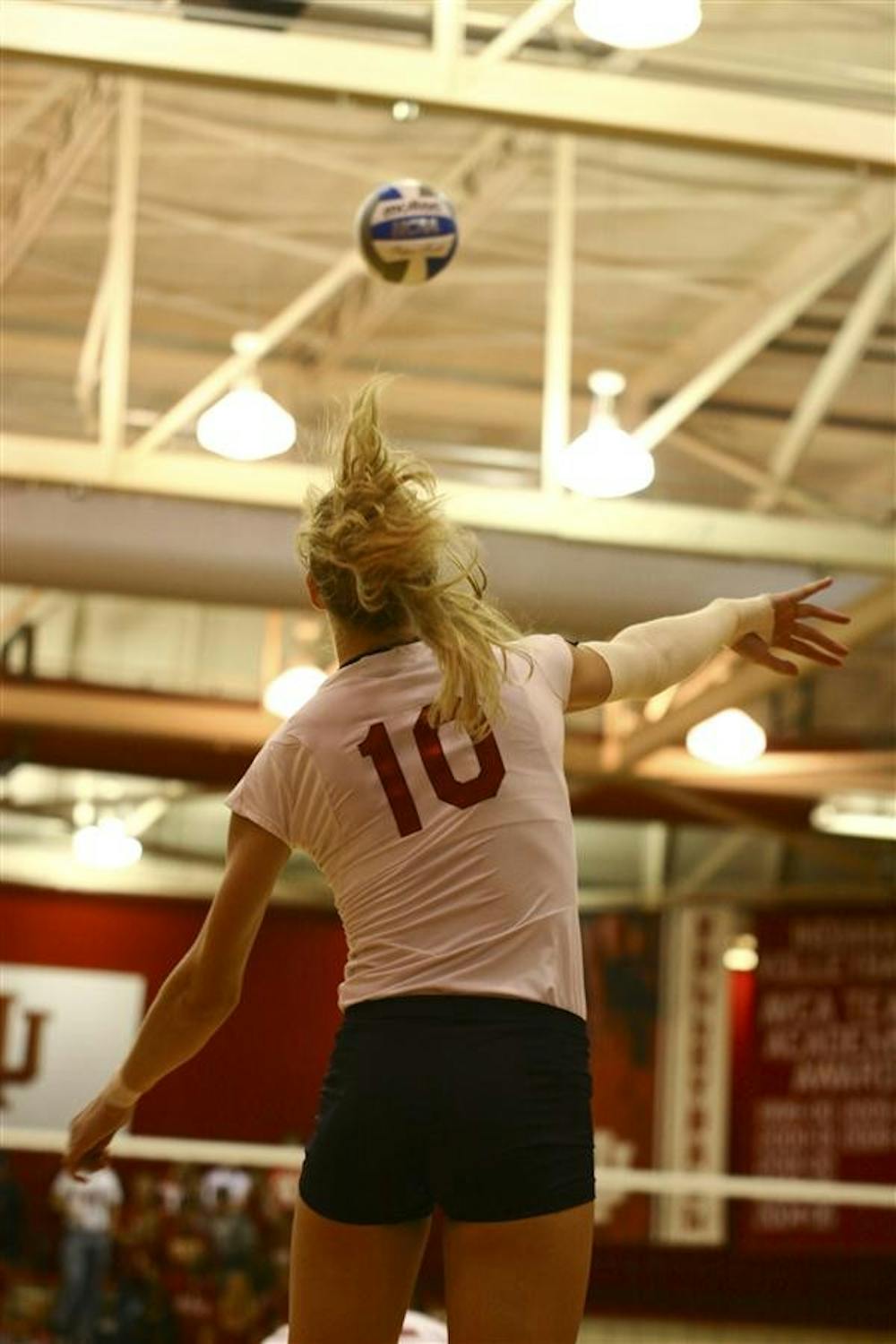 Senior Ashley Benson sends off a serve Friday in University Gym. The Hoosiers defeated the Miami Hurricanes in five sets. Alycin Bektesh