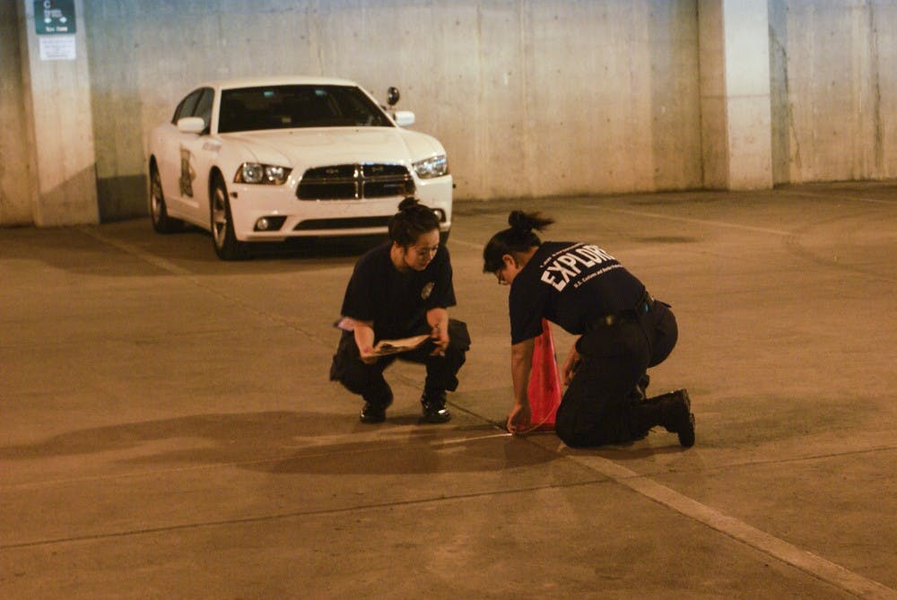 Liana Fang and Anny Lum measure the distance from a car to a dummy victim in a mock car accident during the National Law Enforcement Exploring Conference Wednesday. The biennial week-long workshop has attracted 1,000 law officials to guide approximatekly 2,000 attendees through exercises, seminars and team competitions pertaining to topics within law enforcement. "We're trying to give kids first-hand experience what it's like to be in that career, so when they're ready to make a commitment to come to; a university or post-secondary education or training, they've got a little bit of, 'You know I really think I'd like to do that as a career, '" Marty Walsh, national director of the sponsoring organization Learning for Life, said.