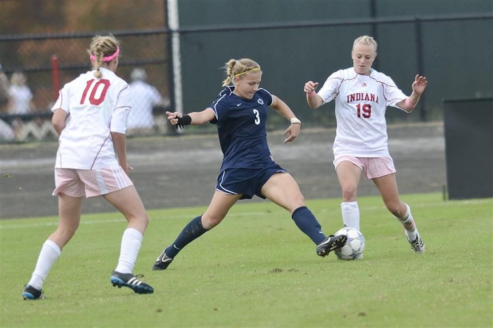 Sophomore midfielder Becca Zambon attempts to gain possession of the ball during the Hoosiers' 3-0 loss to Penn Sunday at the Bill Armstrong Stadium.