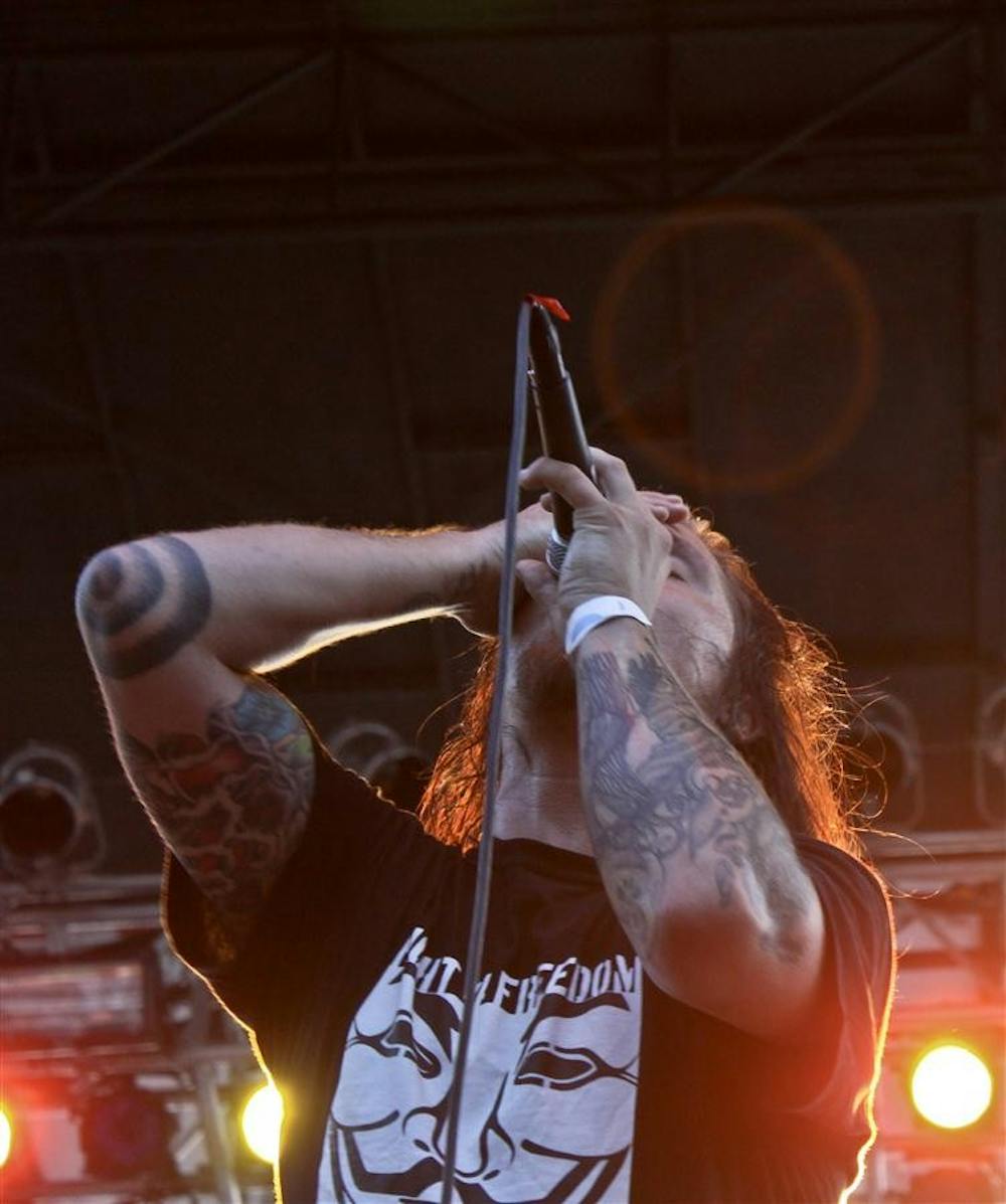 Blind Melon lead singer Travis Warren performs Saturday at the Indianapolis Rib America Festival. During the show, Warren asked an audience member to join him for a song. When no one from the front row was willing, Alison Ruess jumped a fence to take on the task.