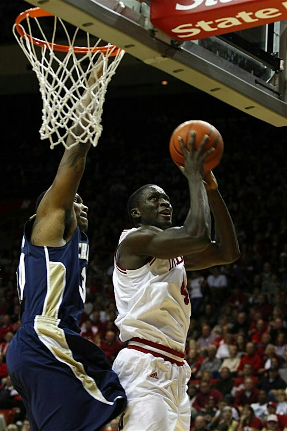 IU Sophomore guard Victor Oladipo shoots a lay up over a UTC defender Sunday at Assembly Hall.