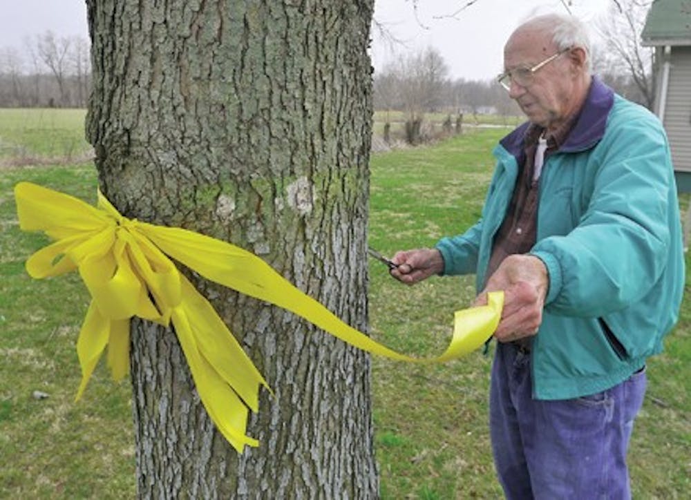 Jack Schimmel cuts the yellow ribbon from in front of his rural Vigo County, Ind., home Monday, March 31, 2008. He and his wife Barbara, had received word Sunday that there grandson, Army Sgt. Keith "Matt" Maupin's remains had been identified in Iraq. Maupin has been missing since his fuel convoy was ambushed nearly four years ago.(AP Photo/Tribune-Star, Jim Avelis)