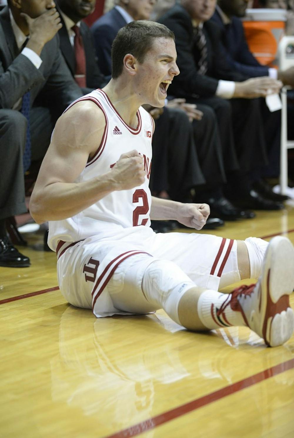 Junior Nick Zeisloft celebrates after making his three point shot while being fouled in IU's game against Southern Methodist on Thursday at Assembly Hall. Ben Mikesell and Ben Mikesell