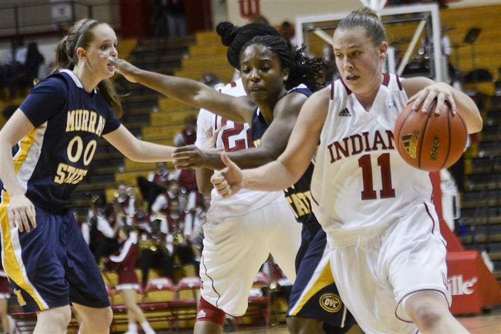 Sophomore guard Andrea Newbauer dribbles the ball during the Hoosiers' 70-67 victory against Murray State Monday at Assembly Hall. Steph Langan