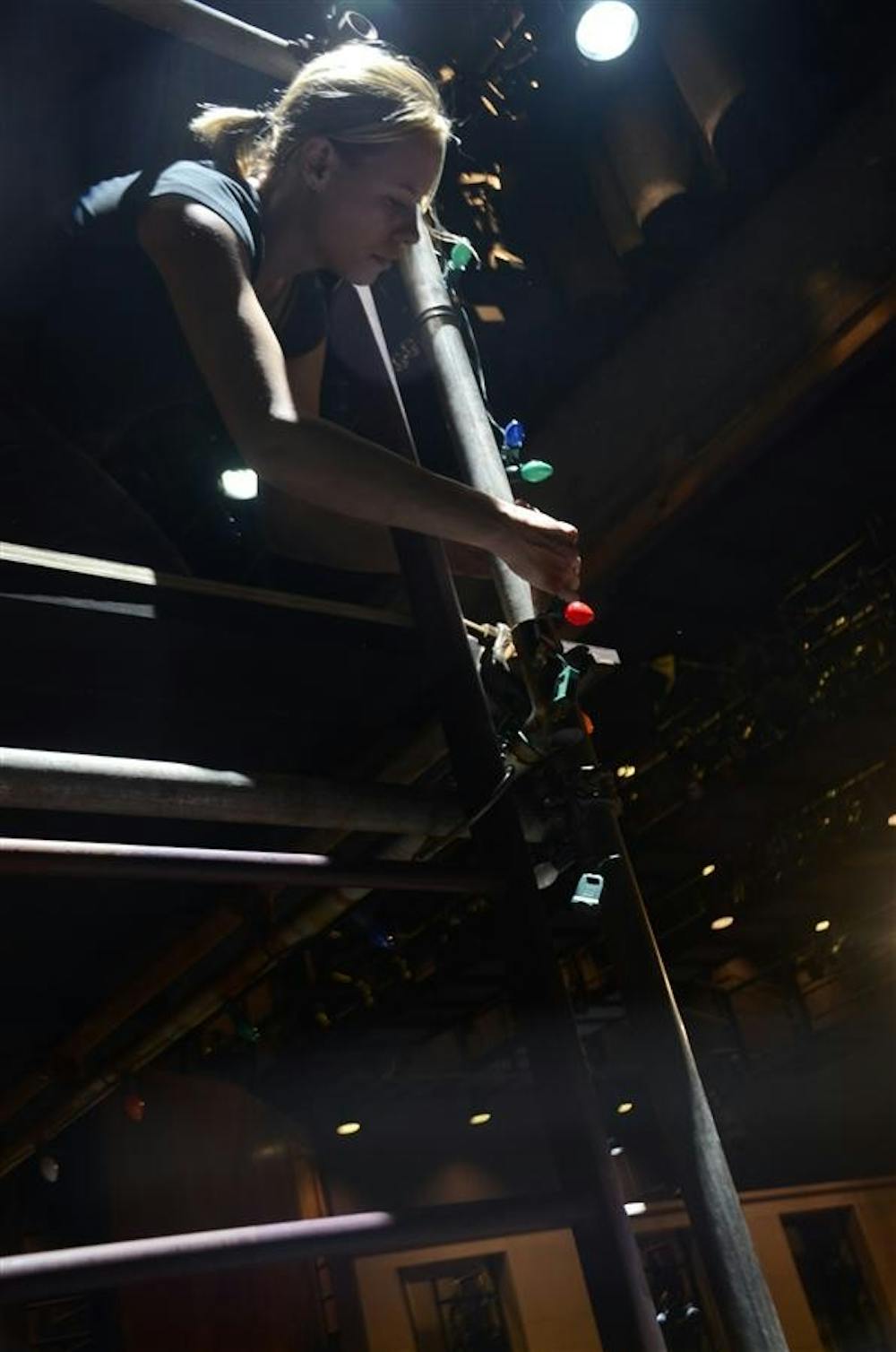 First year MFA lighting design student Lee strings lights upon scaffolding Friday on the stage of the Ruth N. Halls Theatre. The stage design for "Hair" includes scaffolding for the performers to climb on during different parts throughout the musical.