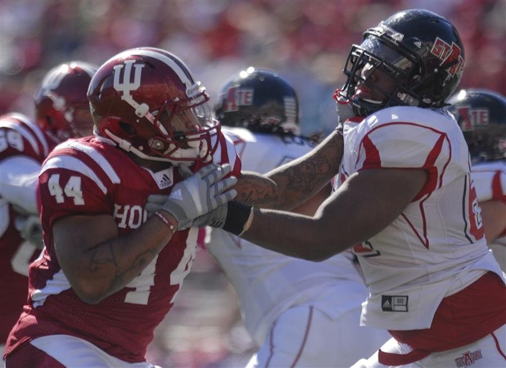 Defensive end Darius Johnson tries to get past Arkansas State offensive lineman Kiano Prater during the second half of IU's Homecoming game against the Red Wolves on Saturday at Memorial Stadium. The Hoosiers never sacked Arkansas State quarterback Ryan Aplin, while the Red Wolves sacked quarterback Ben Chappell twice for 11 lost yards.