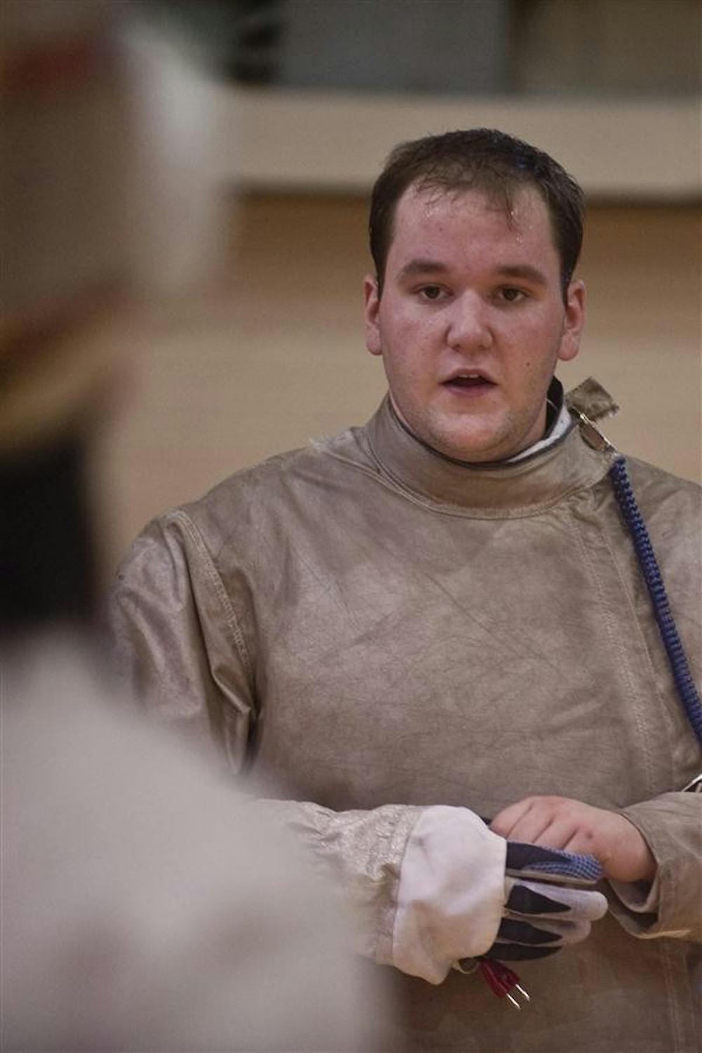 Sophomore Eric Doyle gives other fencers tips at practice Tuesday in the School of Health, Physical Education and Recreation building. Doyle said fencing is more than just hitting sticks together. "It takes a little more finesse," he said.