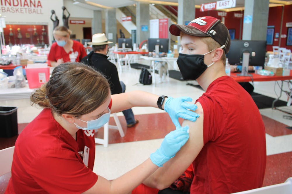 Bryce Asher, an IU junior studying math, gets his first dose of the COVID-19 vaccine at 4:30 p.m. April 12 in Simon Skjodt Assembly Hall. IU nursing student Maddy Anderson administered Asher's vaccine.