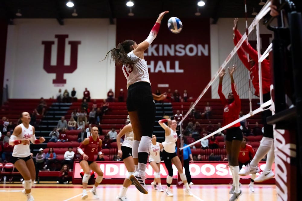 Senior opposite hitter Avry Tatum hits the ball during the game against Rutgers on Nov. 20, 2025 at Wilkinson Hall in Bloomington. Tatum scored 12.5 points in the game. Katie Newett