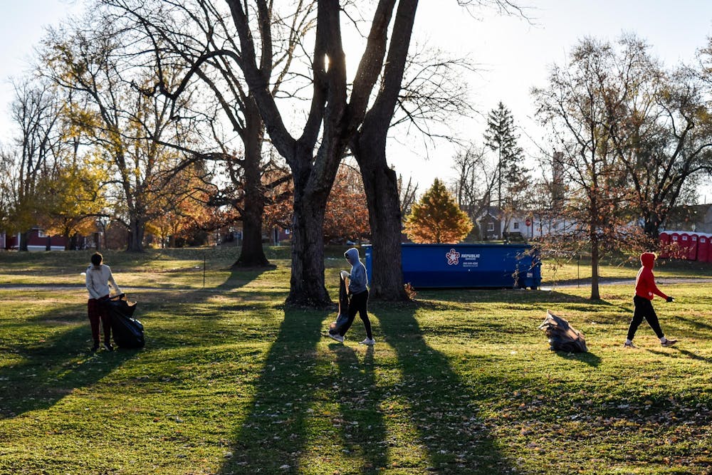 Three members of the Edgewood High School football team scour the tailgate fields for remaining trash the morning of Nov. 16, 2025, at IU’s tailgate fields across the street from Memorial Stadium. The team attempted to start in a line as they combed through sections of the fields methodically, but it rarely stayed that way.