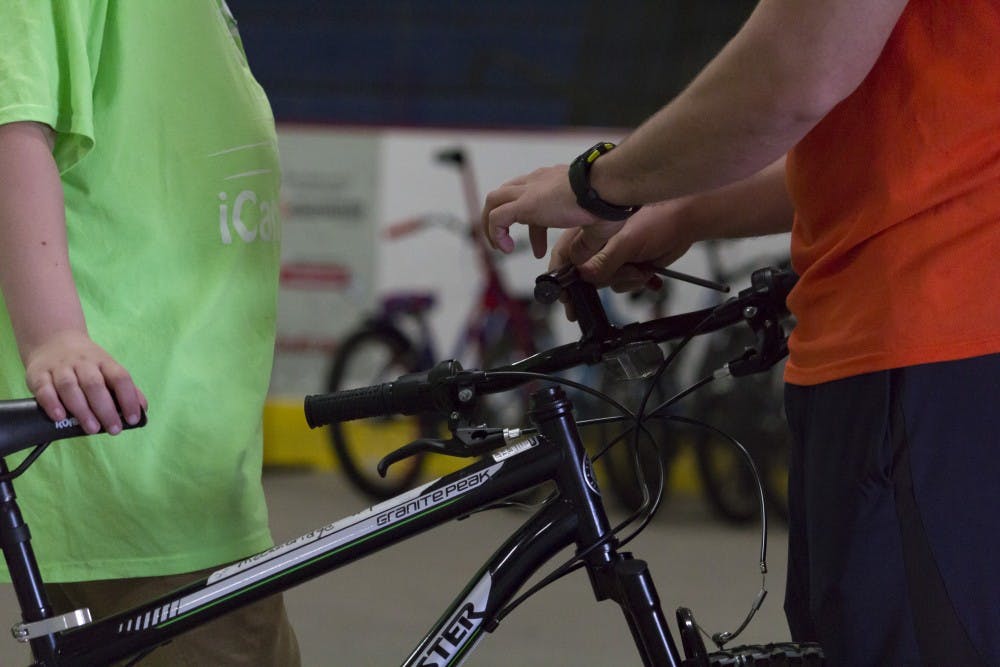 Bike technician Clayton Whalen (right) assists with adjustments for a rider Thursday, May 17, at the iCan Bike Camp in Frank Southern Ice Arena.