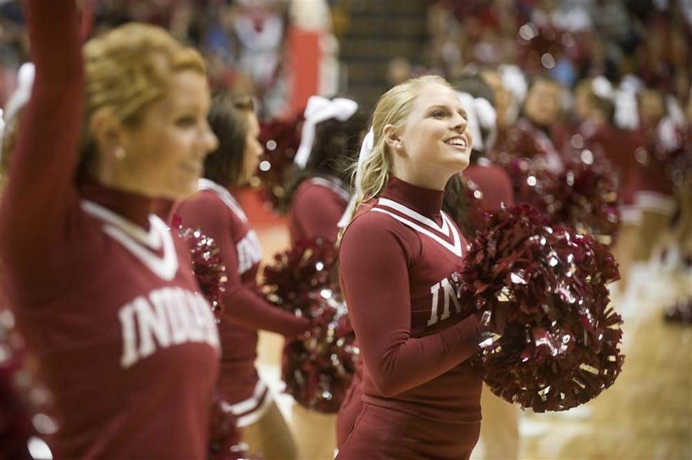 IU cheerleaders entertain the crowd before team introductions during Hoosier Hysteria on Friday at Assembly Hall.
