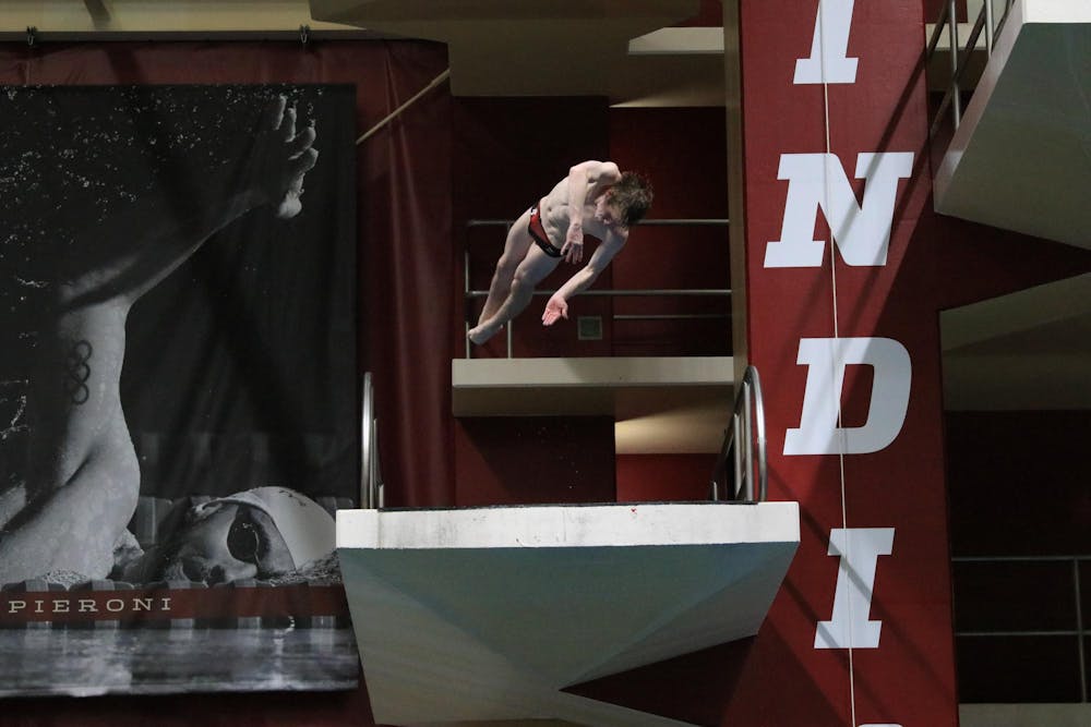 Carson Tyler starts to jump off a platform during the diving team’s practice Jan. 16, 2026, inside the Counsilman-Billingsley Aquatics Center. Tyler competed at the U.S. Olympic Diving Trials in 2021 when he was 16. Emerson Elledge