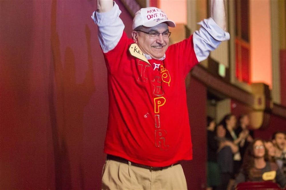 Kelley School of Business professor Keith Dayton runs down to conestant row on Thursday at the IU Auditorium. Dayton was one of the first contestants called.