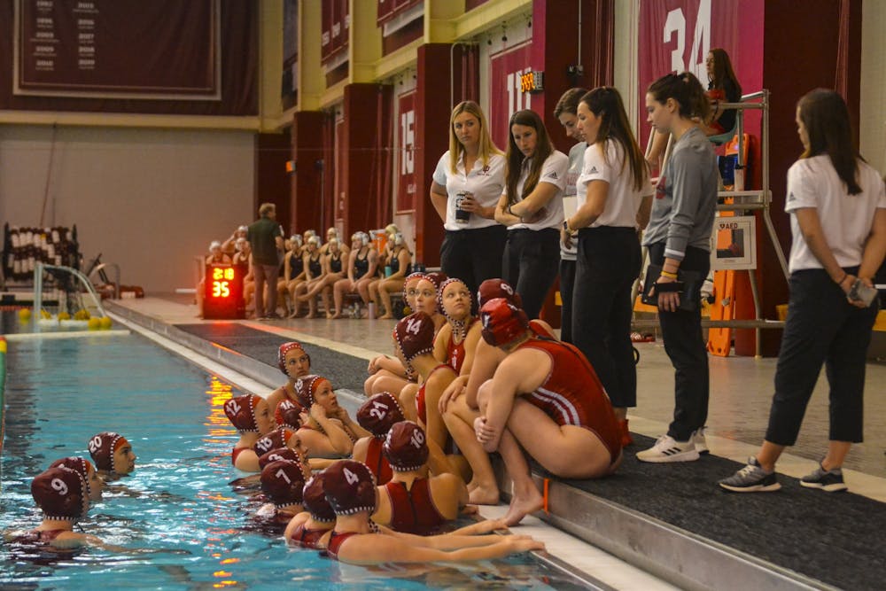 The IU women’s water polo team listens to assistant coach Mackie Beck talk March 7 in the Counsilman-Billingsley Aquatics Center. IU defeated Mercyhurst University 15-5.
