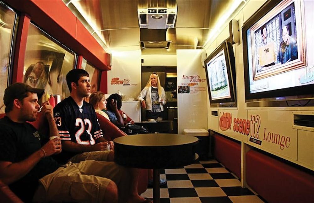 Students enjoy Kramer's Non-Fat Yogurt while watching Seinfeld trivia Wednesday afternoon on the Seinfeld Bus outside the Health, Physical Education and Recreation Building. The bus was part of a tour going around the country visiting college campuses.