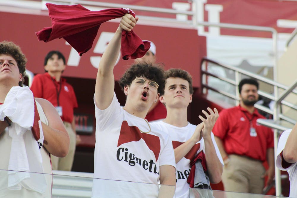 An fan sporting a shirt that says "Cignetti" waves another shirt as they cheer during a game against Florida International University Aug. 31, 2024, at Memorial Stadium in Bloomington. The Hoosiers defeated the Panthers 31-7.