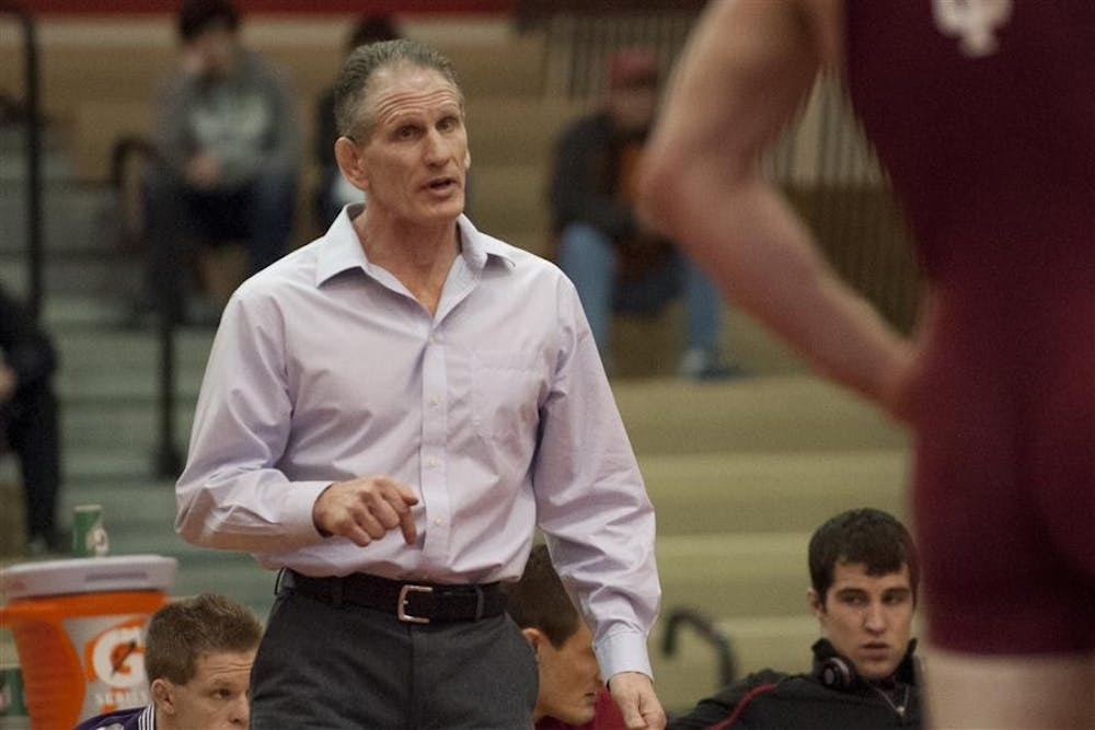 Head Coach Duane Goldman instructs one of his wrestlers during IU's meet against Penn State on Friday at University Gym.