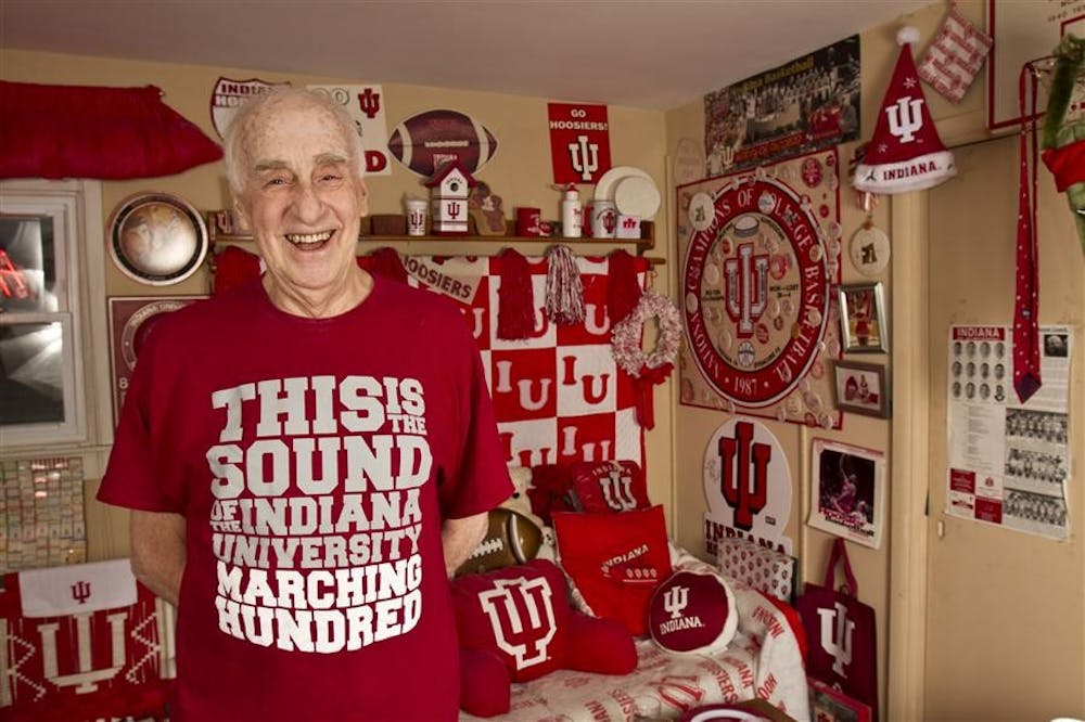 Howard Campell, an 80 year-old IU fan, stands in his "Big Red Room" in his house. Howard has only missed one home basketball game since 1969, and has kept all of his tickets to winning games. Steph Aaronson