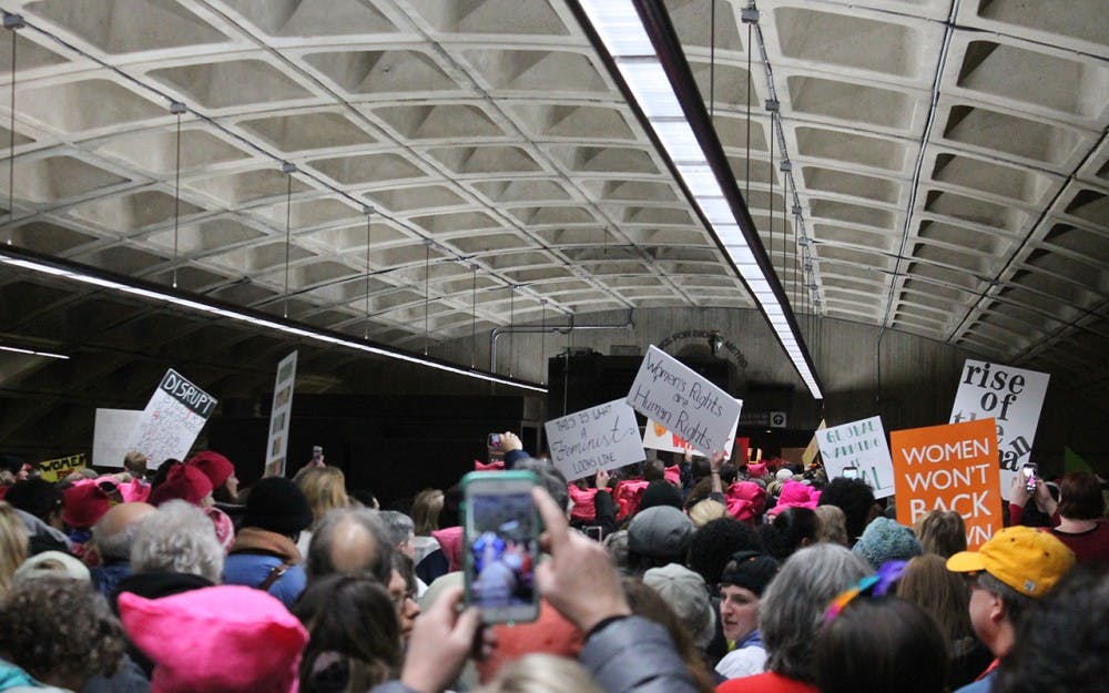 Protestors exit the Metro station near the Federal Building to join the Women's March on Washington. Matt Rasnic and Matt Rasnic