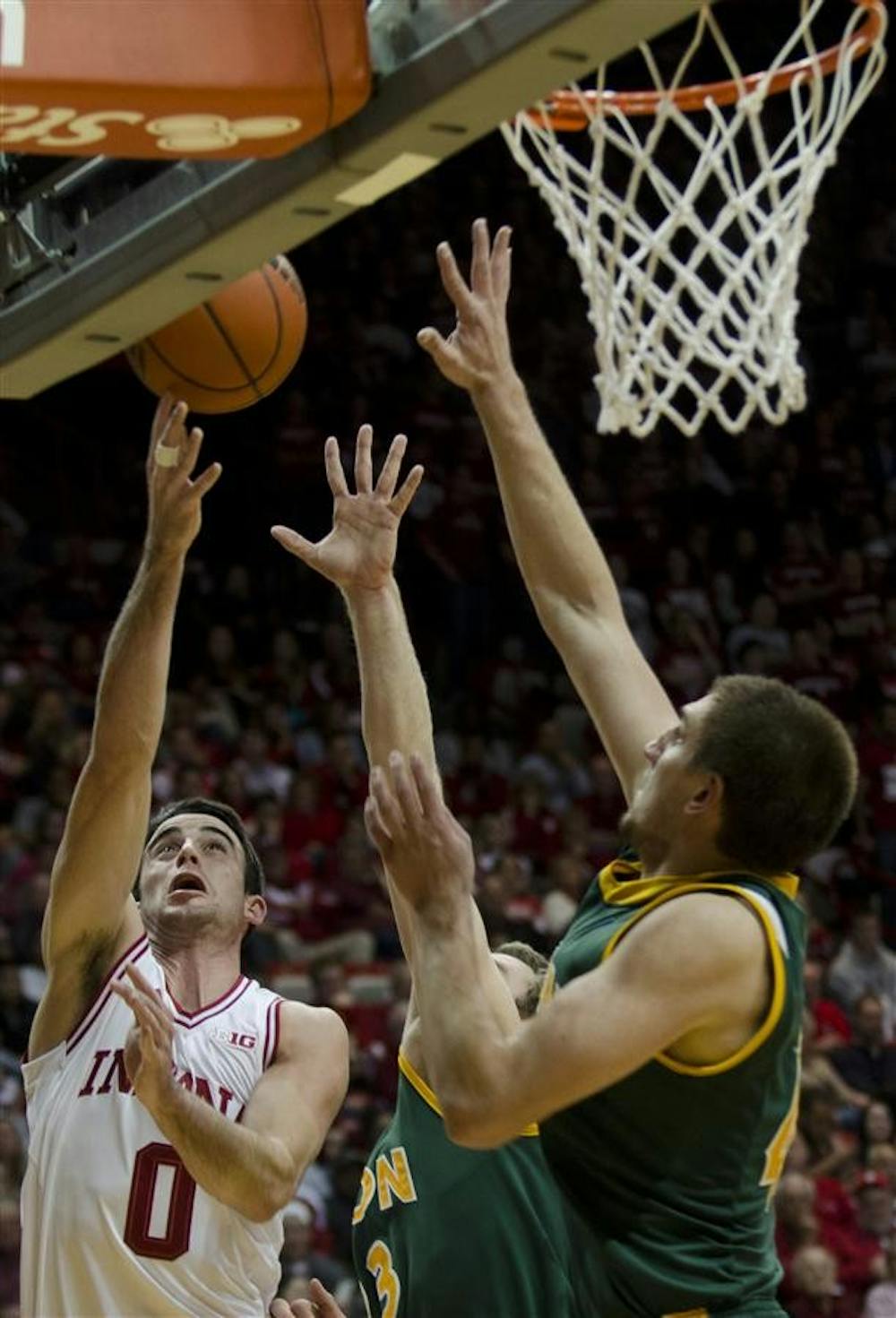 Junior forward Will Sheehey reaches up to shoot a basket during the Hoosiers' 87-61 victory against North Dakota State on Monday at Assembly Hall. Steph Langan
