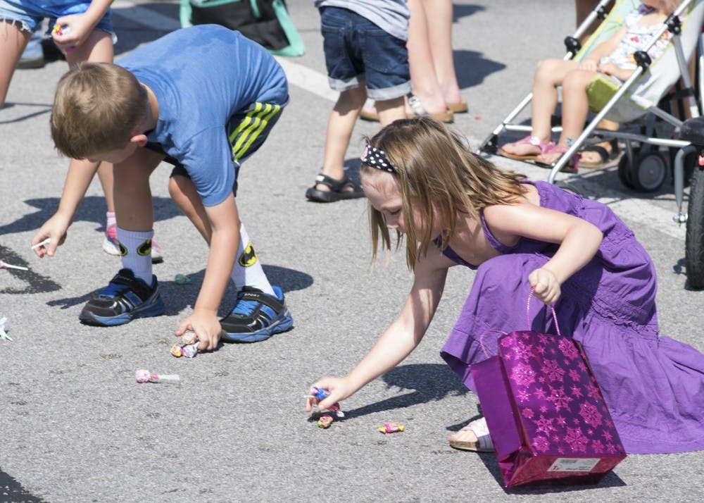Owen Wisniewski, 5, and Avielle Fields, 4, scramble to pick up candy at the parade in Ellettsville on Sept. 23. The parade was part of the Monroe County Fall Festival, which ran Sept. 21-23. Emily Eckelbarger