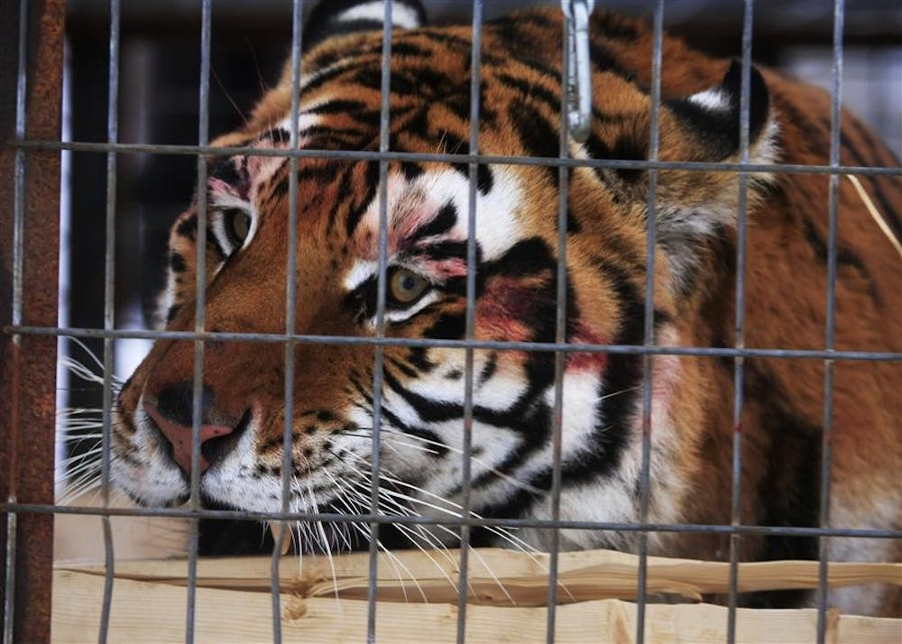 Christopher Robin, one of three rescued tigers, bites through the wooden board used to carry his cage on Dec. 28, 2010 at Fun Spot Amusement Park & Zoo in Angola, Ind. Mark Felix