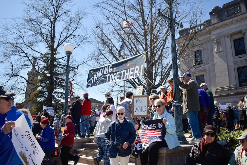 Demonstrators hold signs for passing cars during the “No Kings” protest held in front of the Monroe County Courthouse on March 28, 2026, in Bloomington. Passing cars often honked in support of the demonstration.