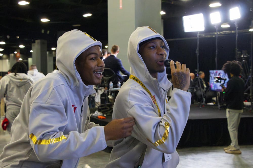 Freshman wide receiver Davion Chandler (left) and freshman defensive back Jaylen Bell (right) play a game on a television during media day Jan. 17, 2026, at the Miami Beach Convention Center in Miami Beach, Florida. Players had many games and activities to interact with.
