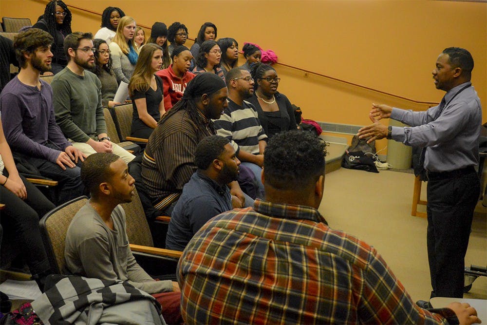 The African American Choir rehearses for the campus’ Martin Luther King celebration Wednesday afternoon at the Neal-Marshall Cultural Center. The choir is expected to deliver a show-stopping performance at Kirkwood Avenue’s Buskirk-Chumley Theatre on Monday.
